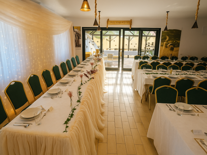 Több szolgáltatóval kapcsolatban vagyunk, akik kiszállítják, szervírozzák a vacsorát. Itt javasoljuk a menüigény összeállítását, amelyre, ha igénylik, helyi és környékbeli szolgáltatókkal konkrét ajánlatokat kérünk be. Itt természetesen tudnunk kell, hogy hány étkezésre tartanak igényt az este folyamán (továbbá leszervezzük a felszolgáló személyzetet is, ha igénylik)